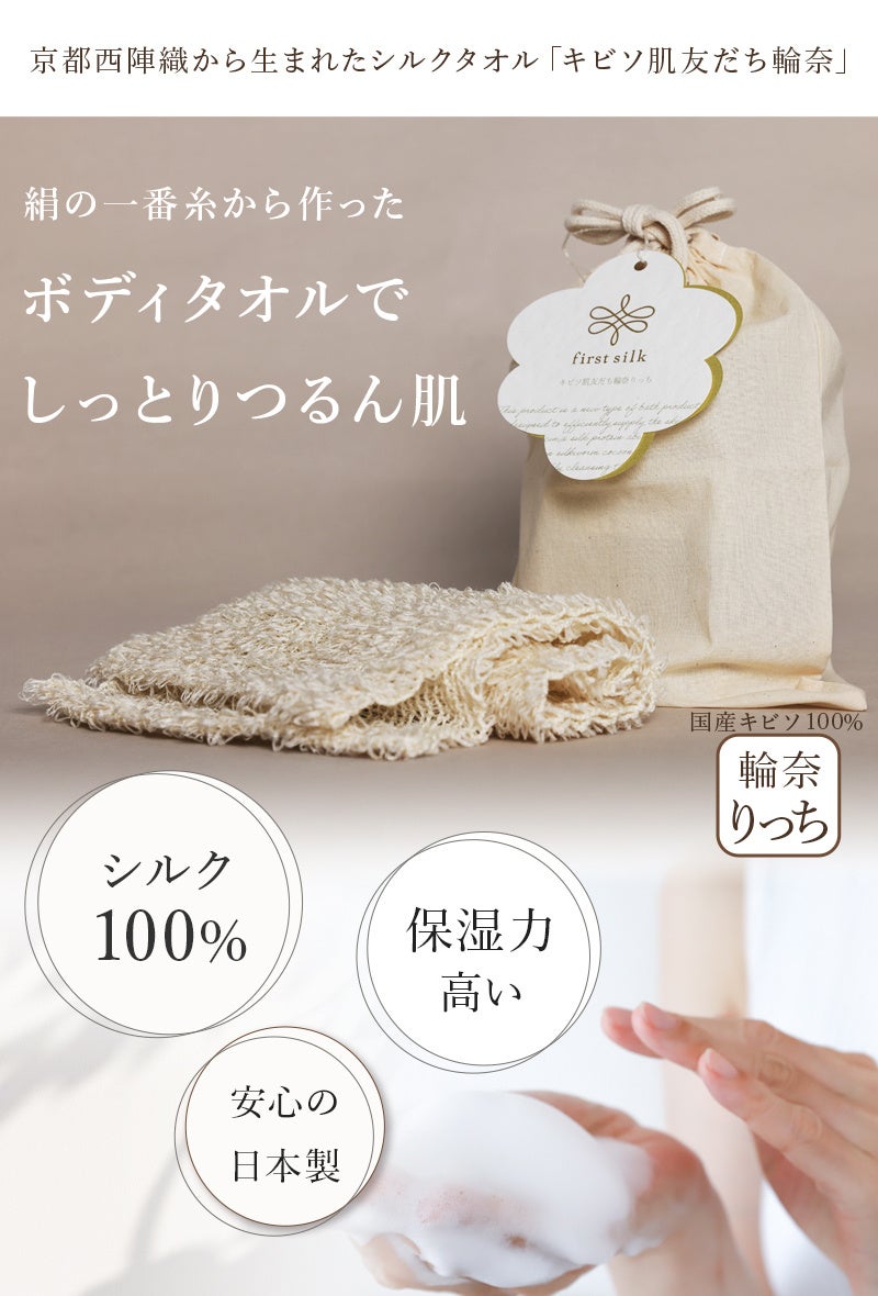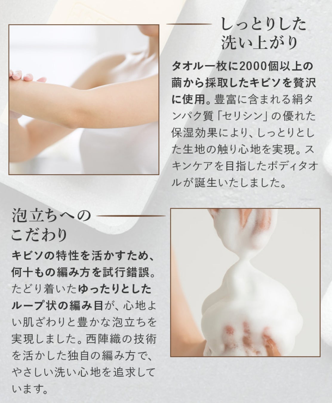 現在、多くの方にとって西陣織は馴染みのないものかもしれません。 今回はキビソに含まれるセリシンに着目したスキンケア用ボディタオルとシルク石鹸を開発いたしました。