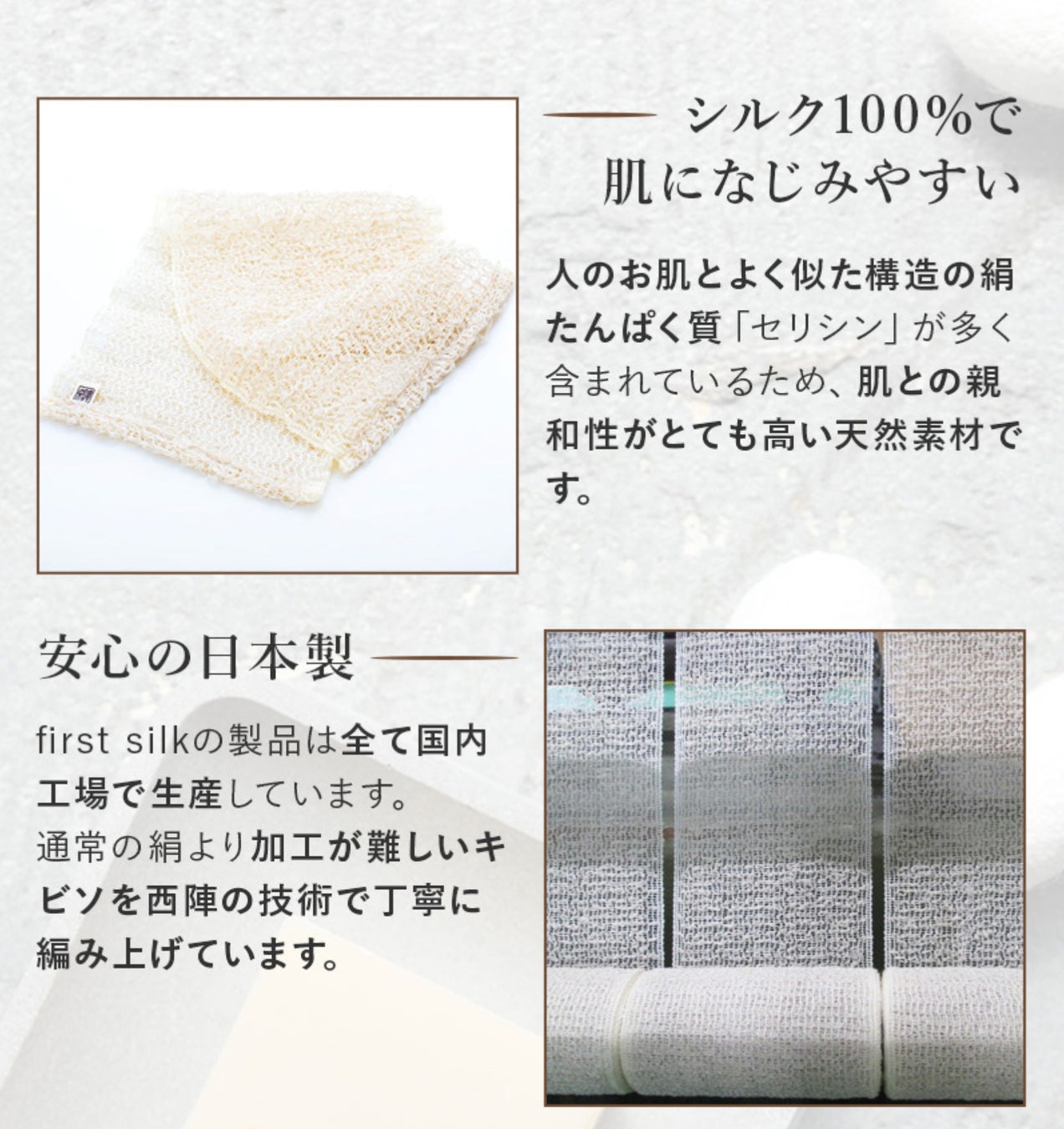 弊社は、西陣織を通じて100年以上シルクに携わってまいりました。この伝統を残し後世に受け継いでいくために、まずはシルクをもっと身近な存在にしたいと考えています。 その取り組みとして「first silkブランド」を立ち上げました。